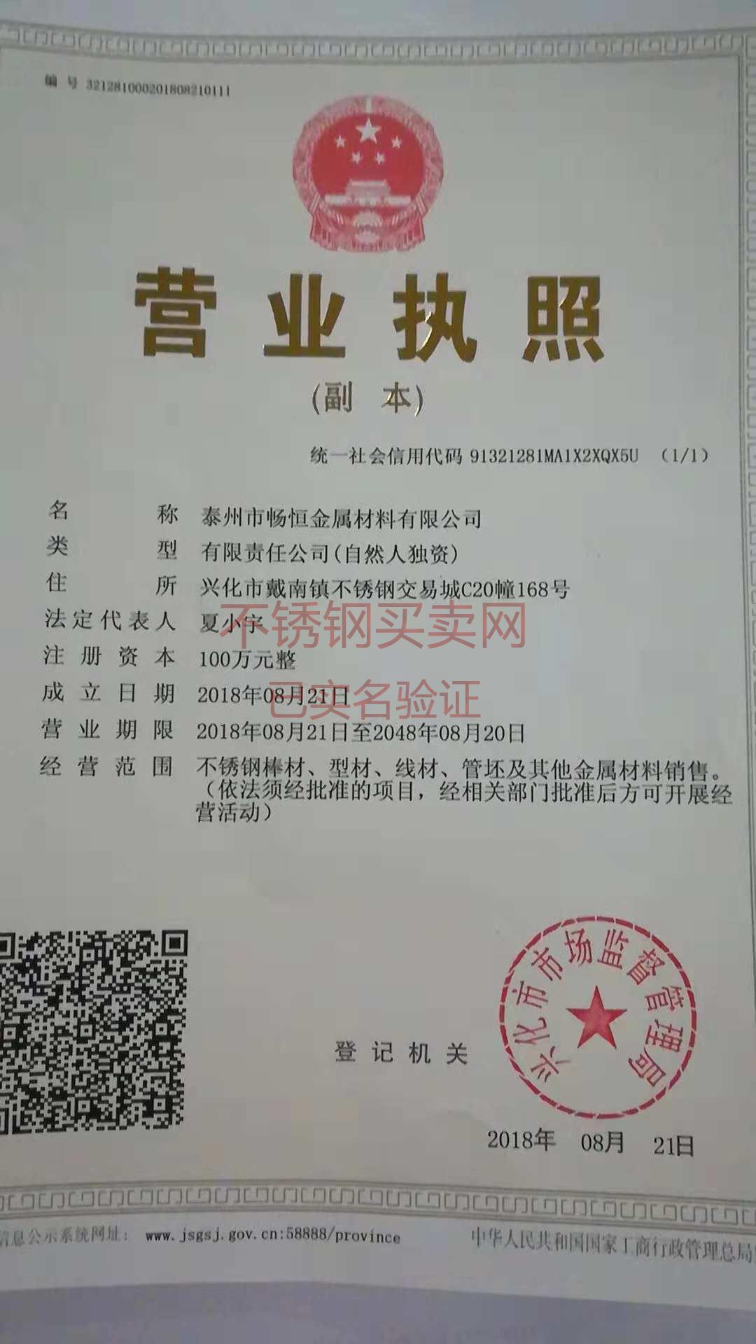 泰州市暢恒金屬材料有限公司(原鑫宇) 地址:江蘇省-泰州市興化市戴南鎮(zhèn)不銹鋼交易城C20幢168號