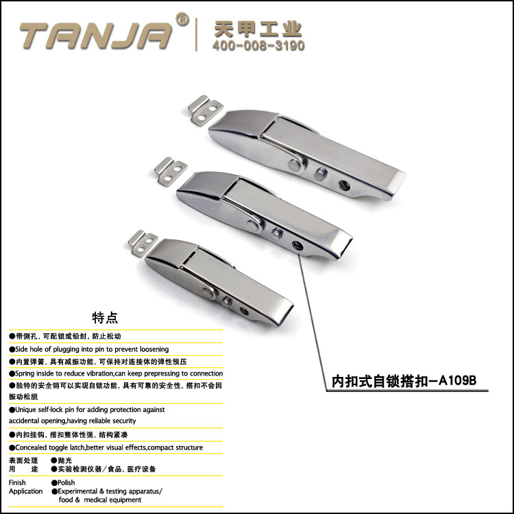 獨特的安全銷可以實現自鎖功能,具有可靠的安全性,搭扣不會因振動松脫
