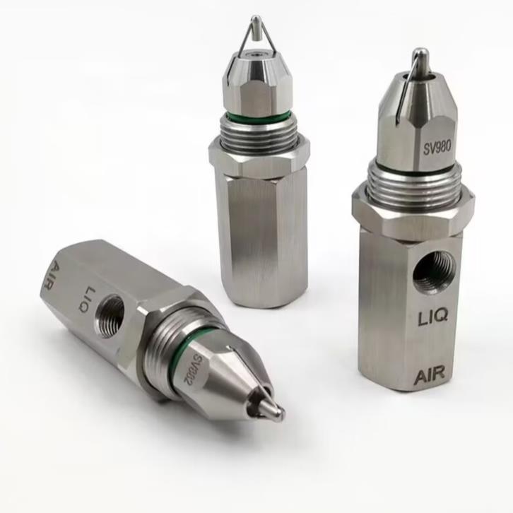 超聲波霧化噴嘴1、細水流被高速流動的氣流剪切形成初步霧化,初步霧化的水滴混合高速氣流,撞擊在震動頭上,進一步霧化為極細顆粒的水霧