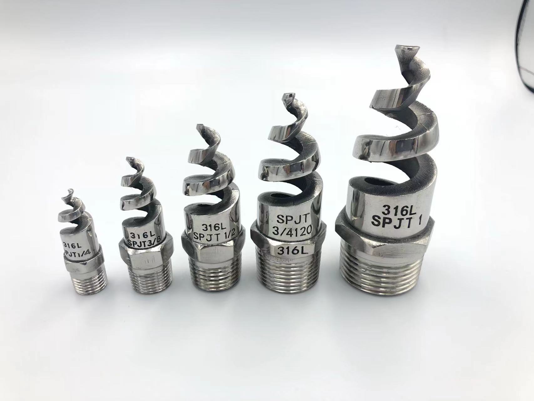 7300SPJT系列螺旋噴嘴能產生實心和空心錐形兩種噴霧形狀,該類噴嘴是通過液體與連續支小的螺旋線體相切和碰撞后產生的小水滴噴出,噴嘴外形獨特的設計,最大程度減少了阻塞現象、允許最大的液體流通道可使液體在給定尺寸的管道上達到最大流量,是一類結構緊湊、環保型噴嘴。可提供噴霧夾角從60°-170度供選擇、三公斤壓力下噴量從5.5至4140升/每分鐘、螺紋從1/4至4寸供選擇、也可提供法蘭連接和內螺紋接口、一般采用不銹鋼、塑膠材料制造、也可提供黃銅、鐵氟龍、碳化硅、陶瓷等材料制造。碳化硅螺旋噴嘴提供1/4~4英寸供選擇、碳化硅渦流噴嘴提供給1英寸~6英寸供選擇。