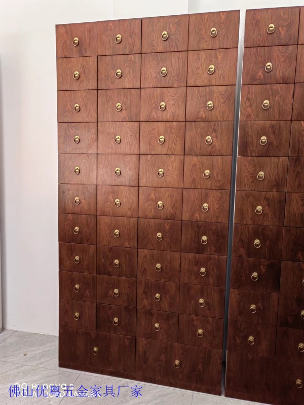 藥柜材質:整體框架選用東北樟松木,抽屜幫樟松木插接木,抽屜面板梧桐整板,抽屜底七厘板,中藥柜側板,后背和頂部為膠合板。