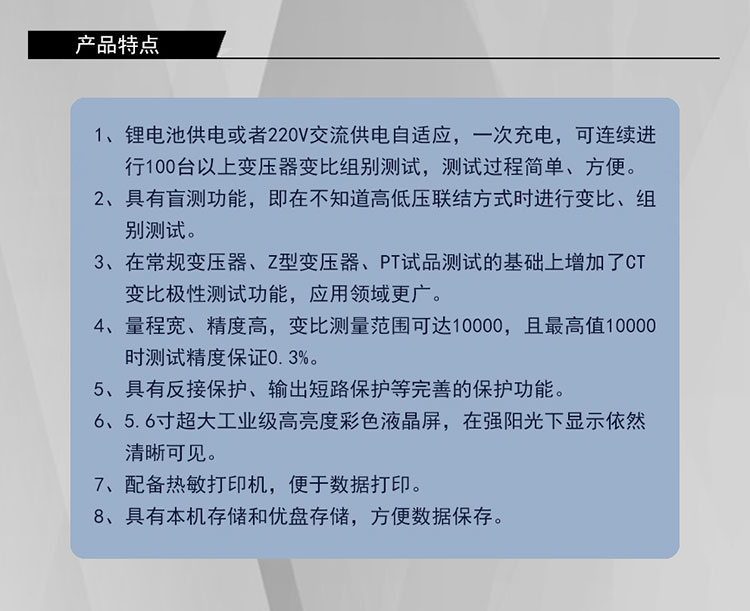 3) 在常規變壓器、Z 型變壓器、PT 試品測試的基礎上增加了 CT 變比極性測試功能,應用領域geng廣。