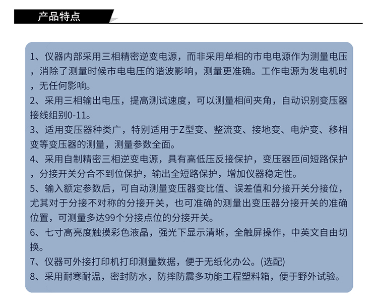 適用變壓器種類廣,特別適用于 Z 型變、整流變、接地變、電爐變、移相變等變壓器的測(cè)量,測(cè)量參數(shù)zui全面。