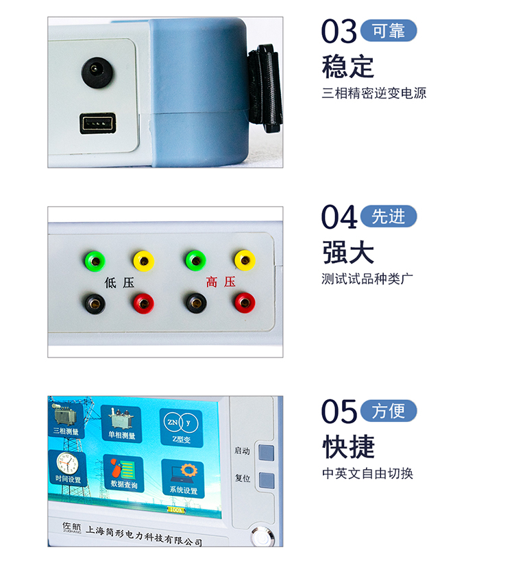 采用自制精密三相逆變電源,具有高低壓反接保護(hù),變壓器匝間短路保護(hù),分接開(kāi)關(guān)分合不到位保護(hù),輸出全短路保護(hù),增加儀器穩(wěn)定性。