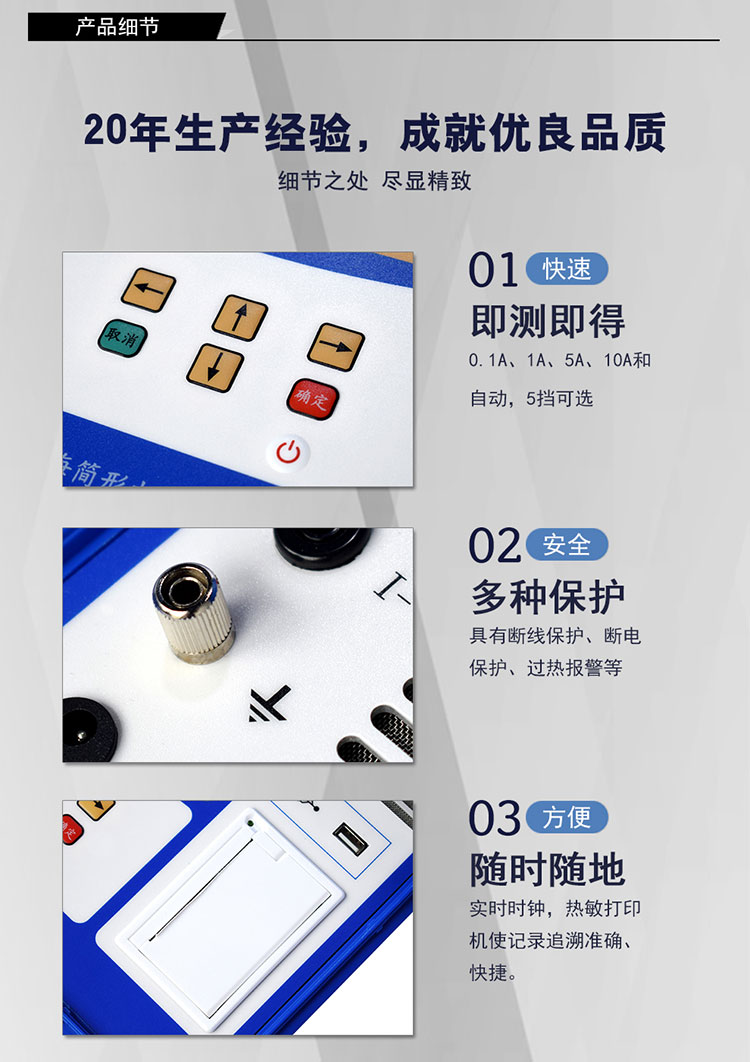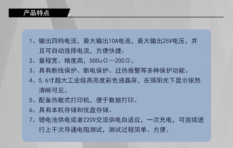 1)鋰電池供電或者220V交流供電自適應,一次充電,可連續進行上千次導通電阻測試,測試過程簡單、方便。