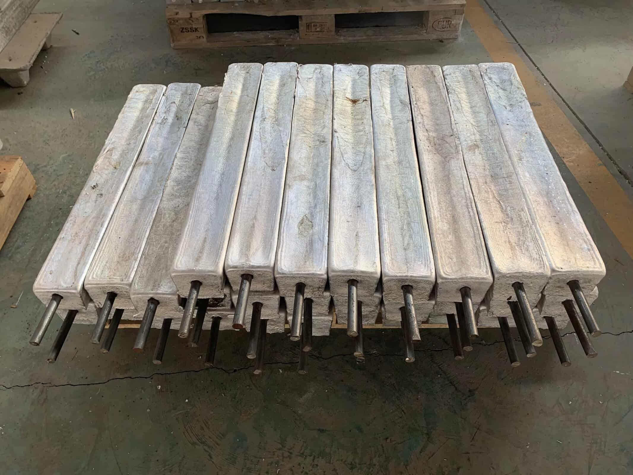 MG-11鎂陽極的外形可根據(jù)使用場景設(shè)計(jì)為梯形、塊狀等,單支重量約11kg,尺寸標(biāo)準(zhǔn)化,便于批量采購和安裝,安裝時(shí)無需復(fù)雜的施工設(shè)備,只需與被保護(hù)金屬結(jié)構(gòu)可靠連接,配合填包料埋設(shè)即可,施工效率高,適合大規(guī)模工程部署。填包料采用75%硫酸鈣、20%膨潤土、5%硫酸鈉的混合配方,能有效降低接觸電阻,延緩陽極消耗,延長使用壽命。